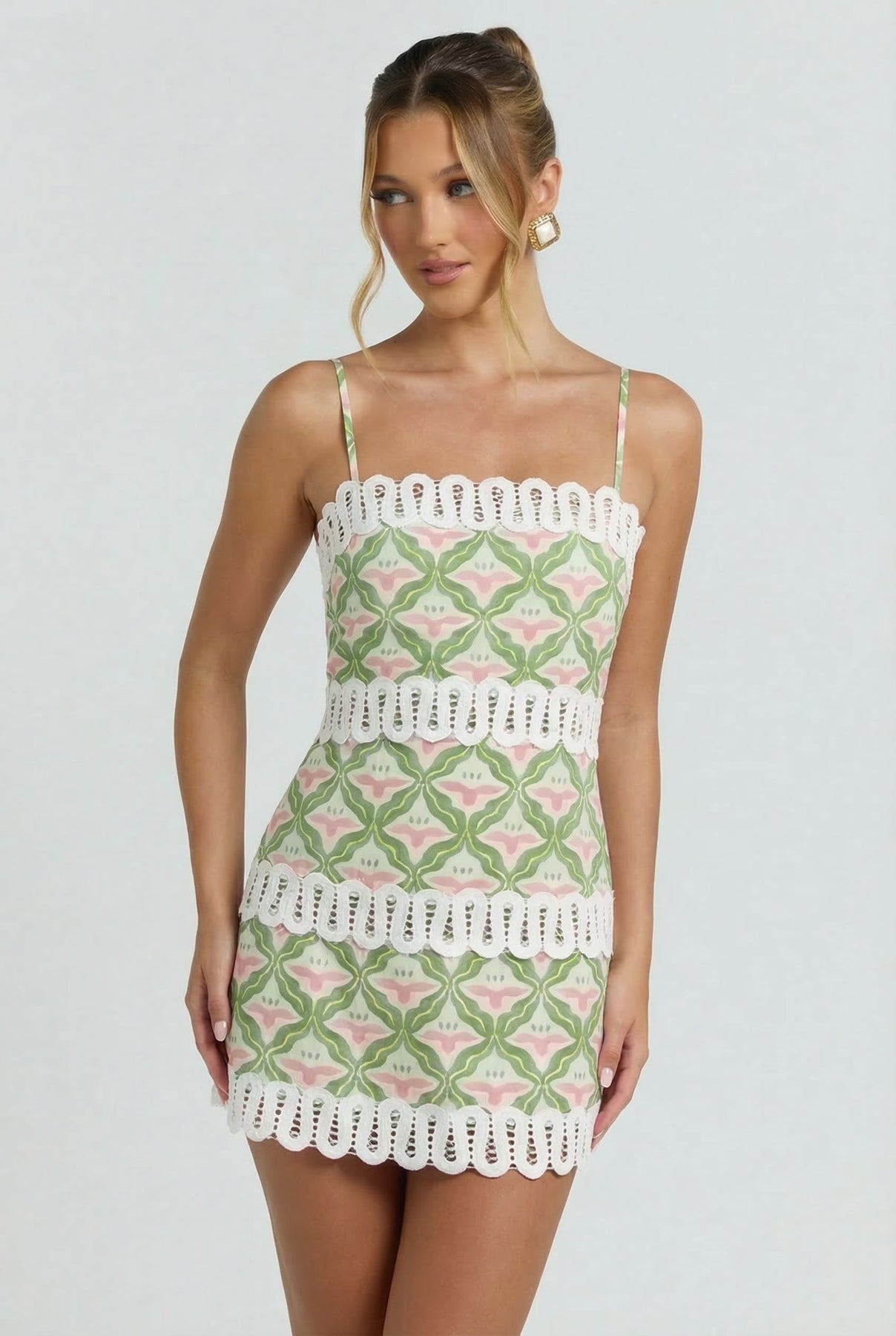 Sweet, playful, and made for sunshine. The Palm Beach Luncheon Mini Dress features a soft tropical-inspired print with delicate lace trim detailing that gives it that effortless coastal charm. The flattering square neckline and adjustable straps keep it comfortable while the flirty mini silhouette makes it perfect for brunch, beach towns, and warm summer nights.