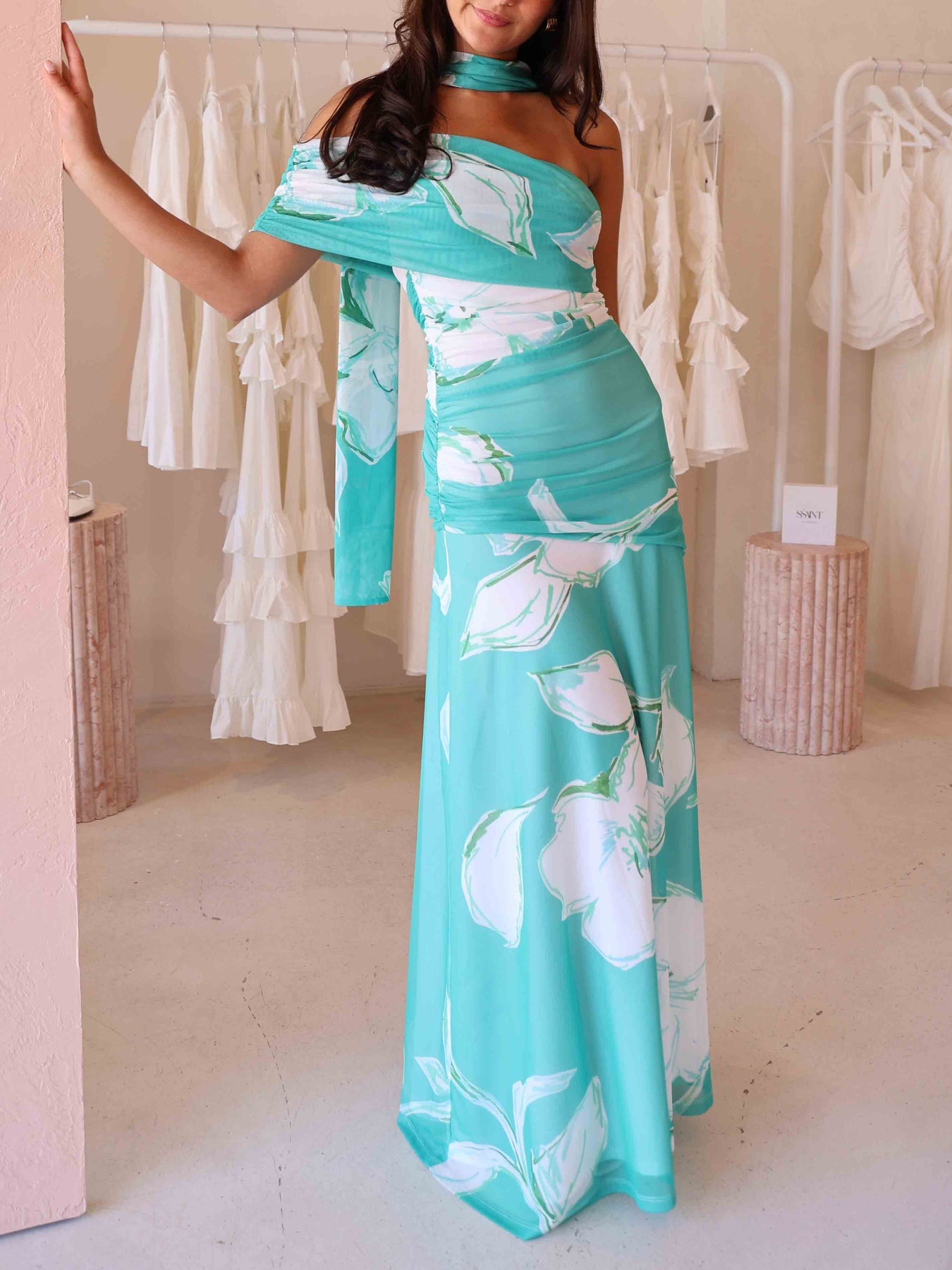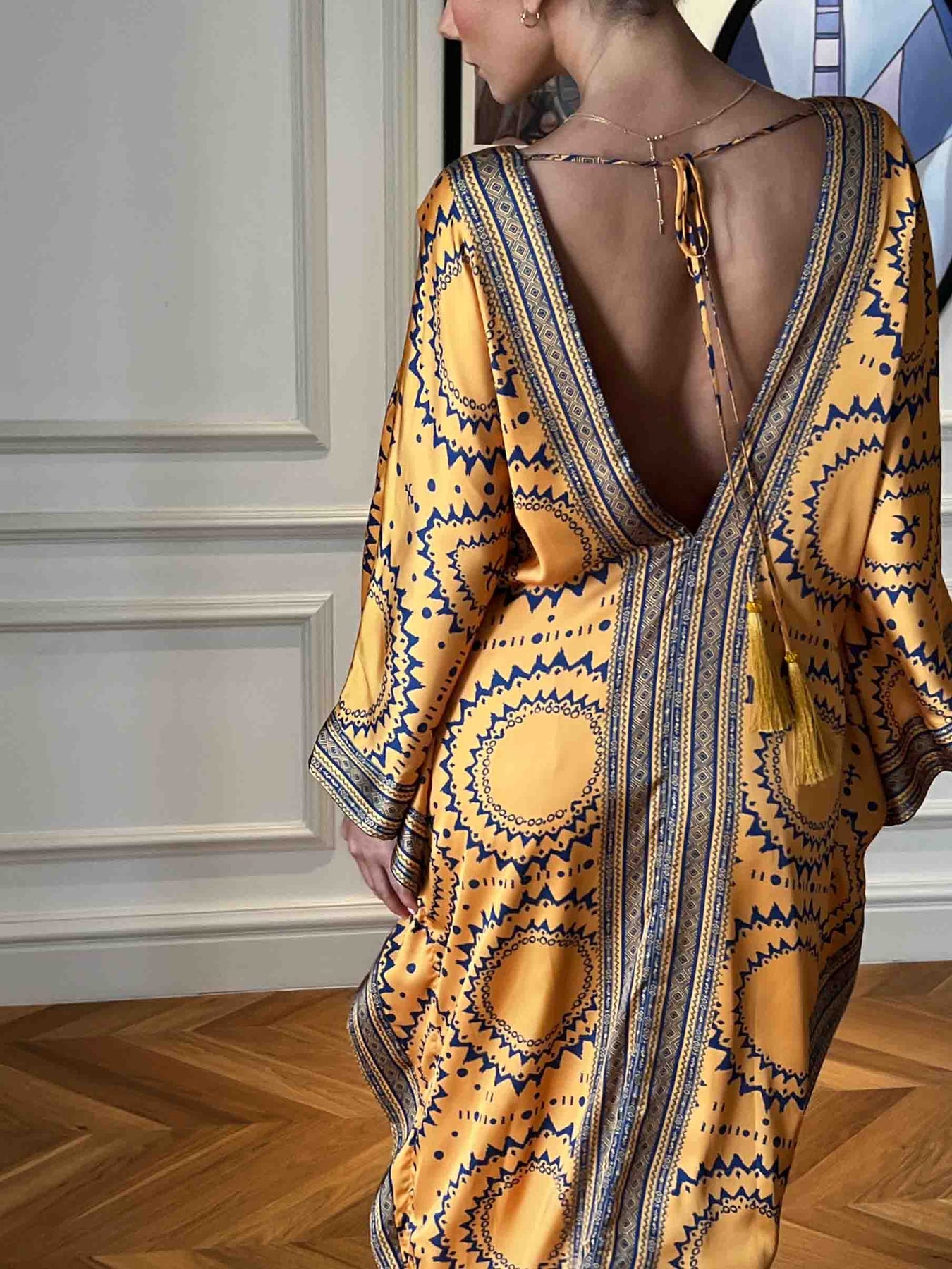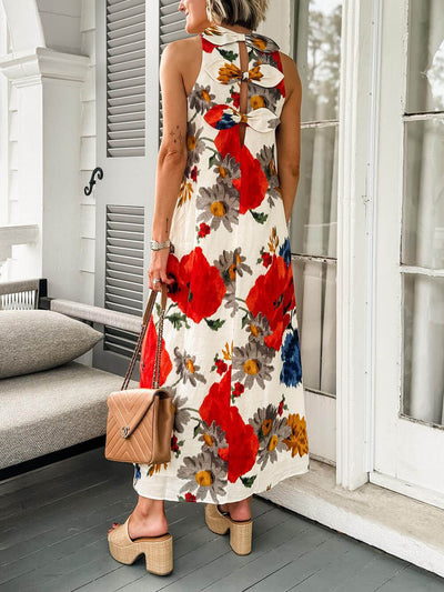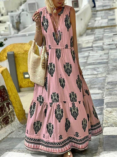 Stay stylish and comfortable in our elegant unique tie-dye print front pleated back slit cutout maxi dress.