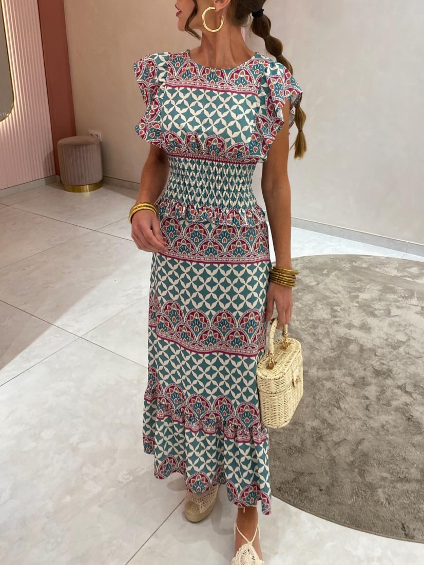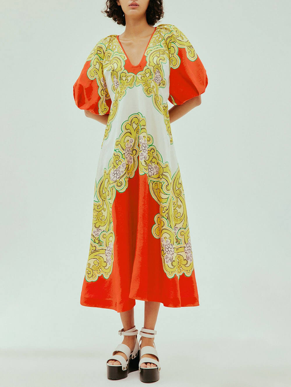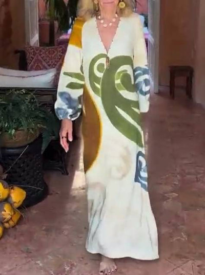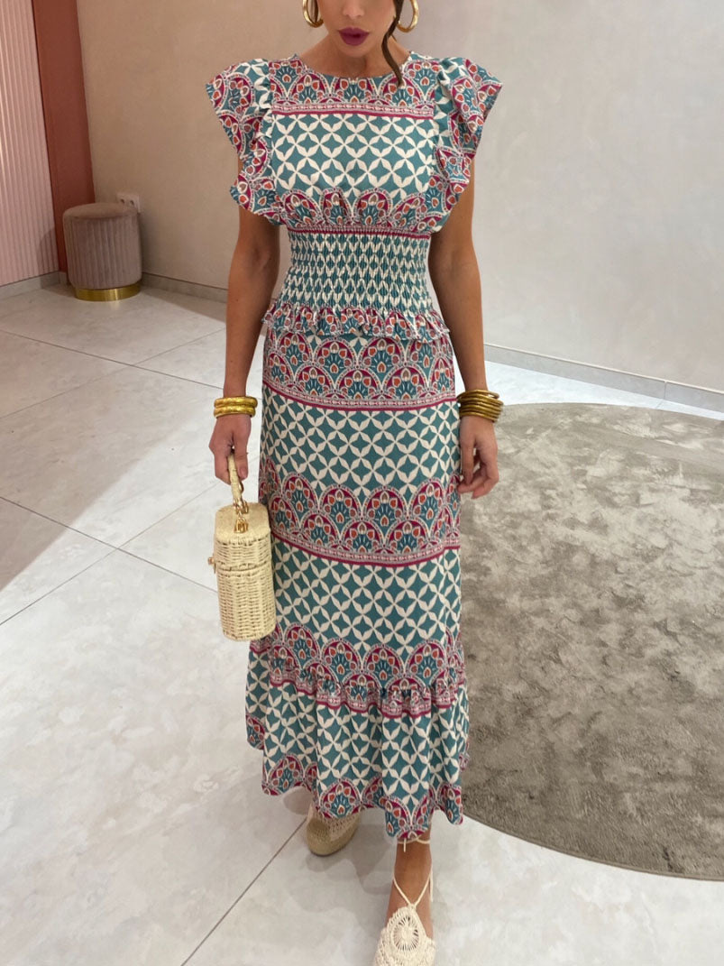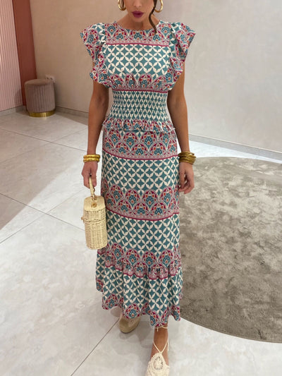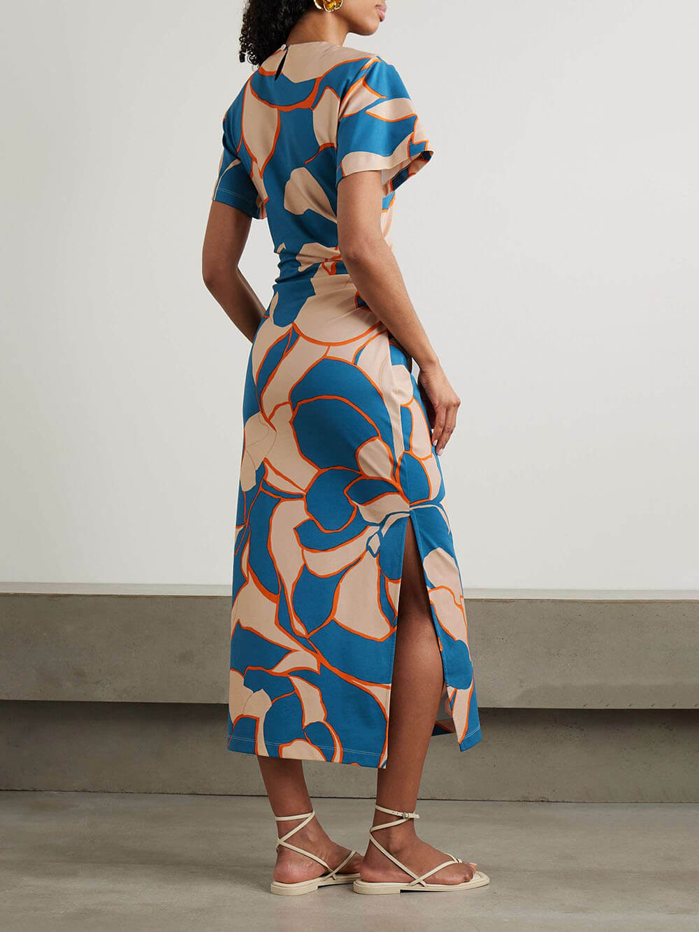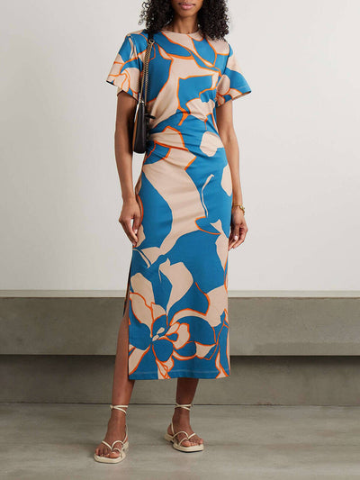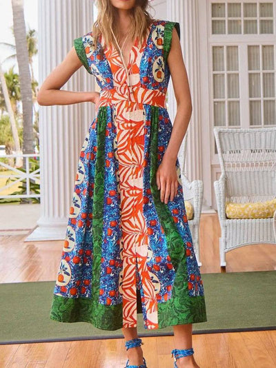 Stay stylish and comfortable in our Vintage Unique Oil Painting Print Ruffle Pleated Slit Midi Dress.