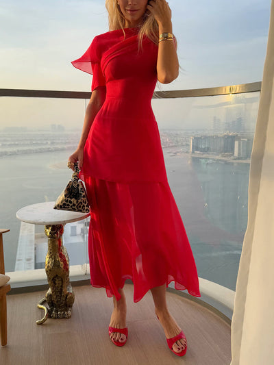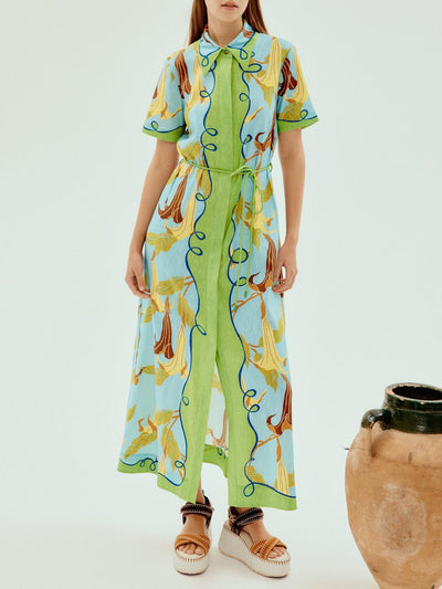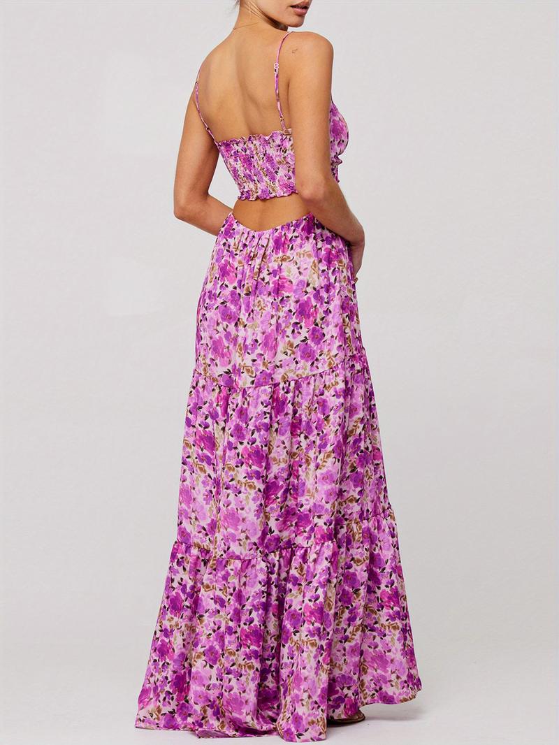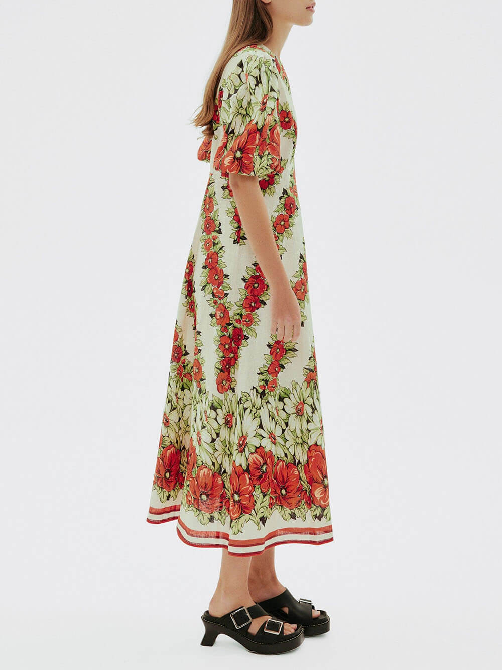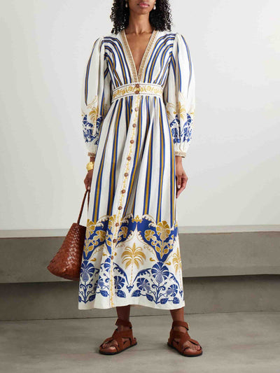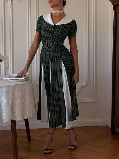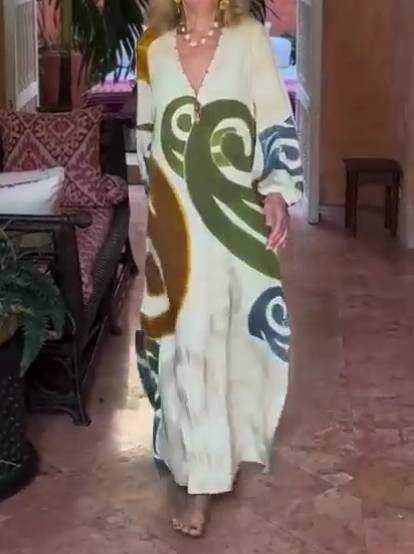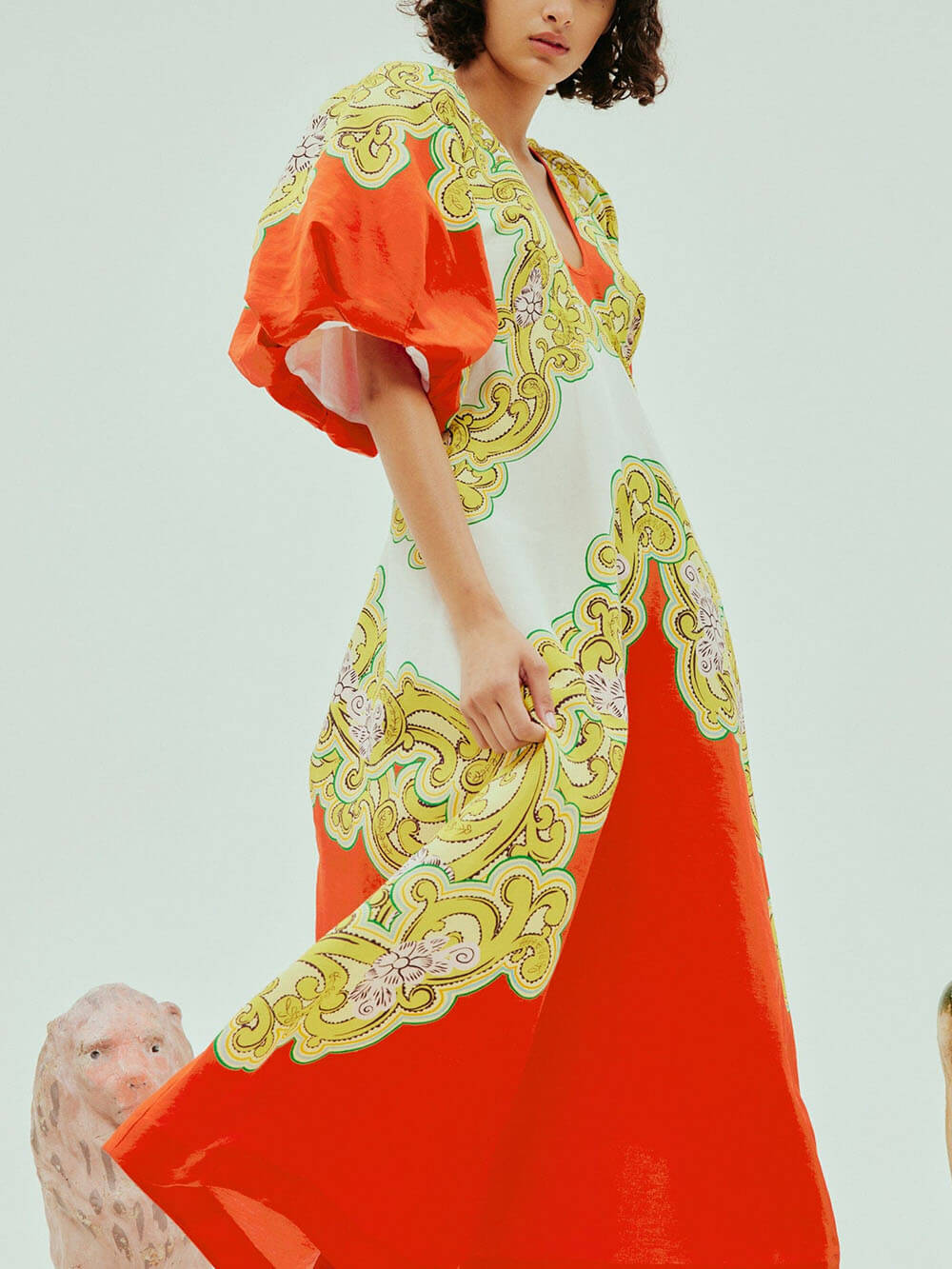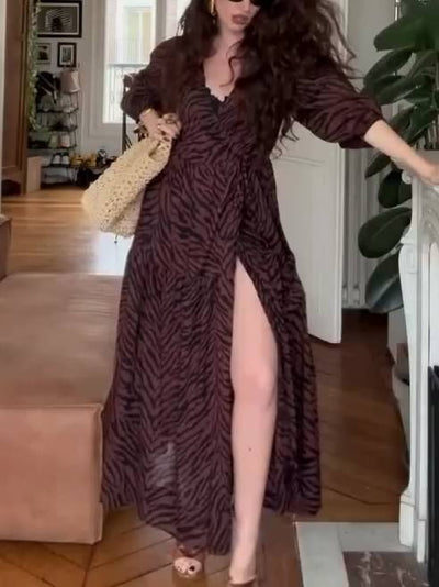 Stay stylish and comfortable in our Vintage Unique Oil Painting Print Ruffle Pleated Slit Midi Dress.