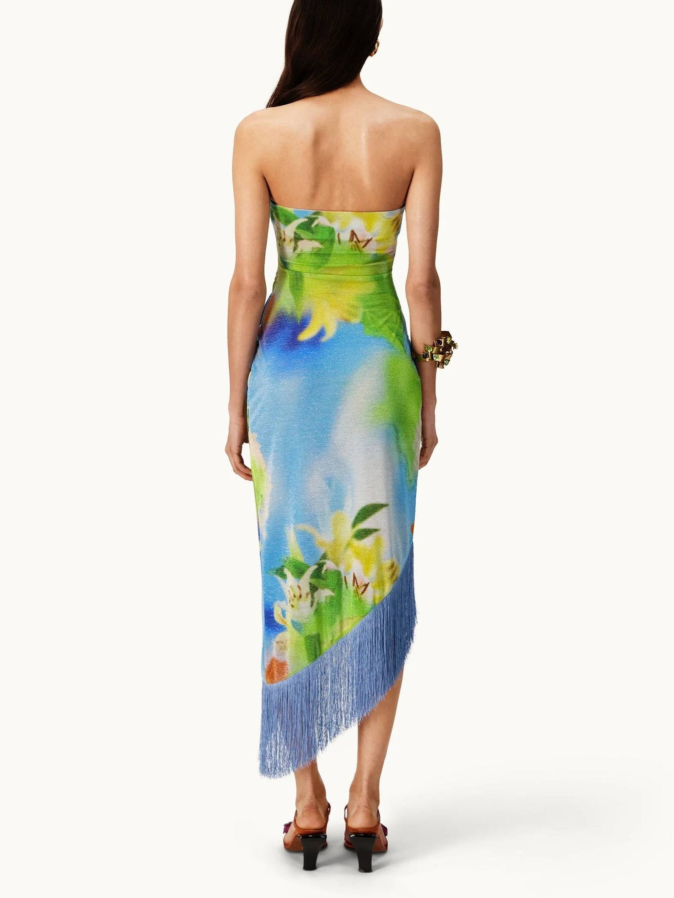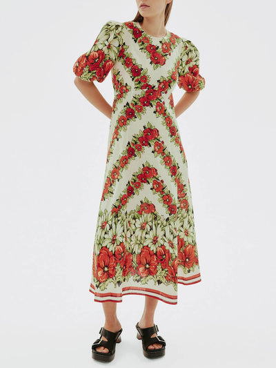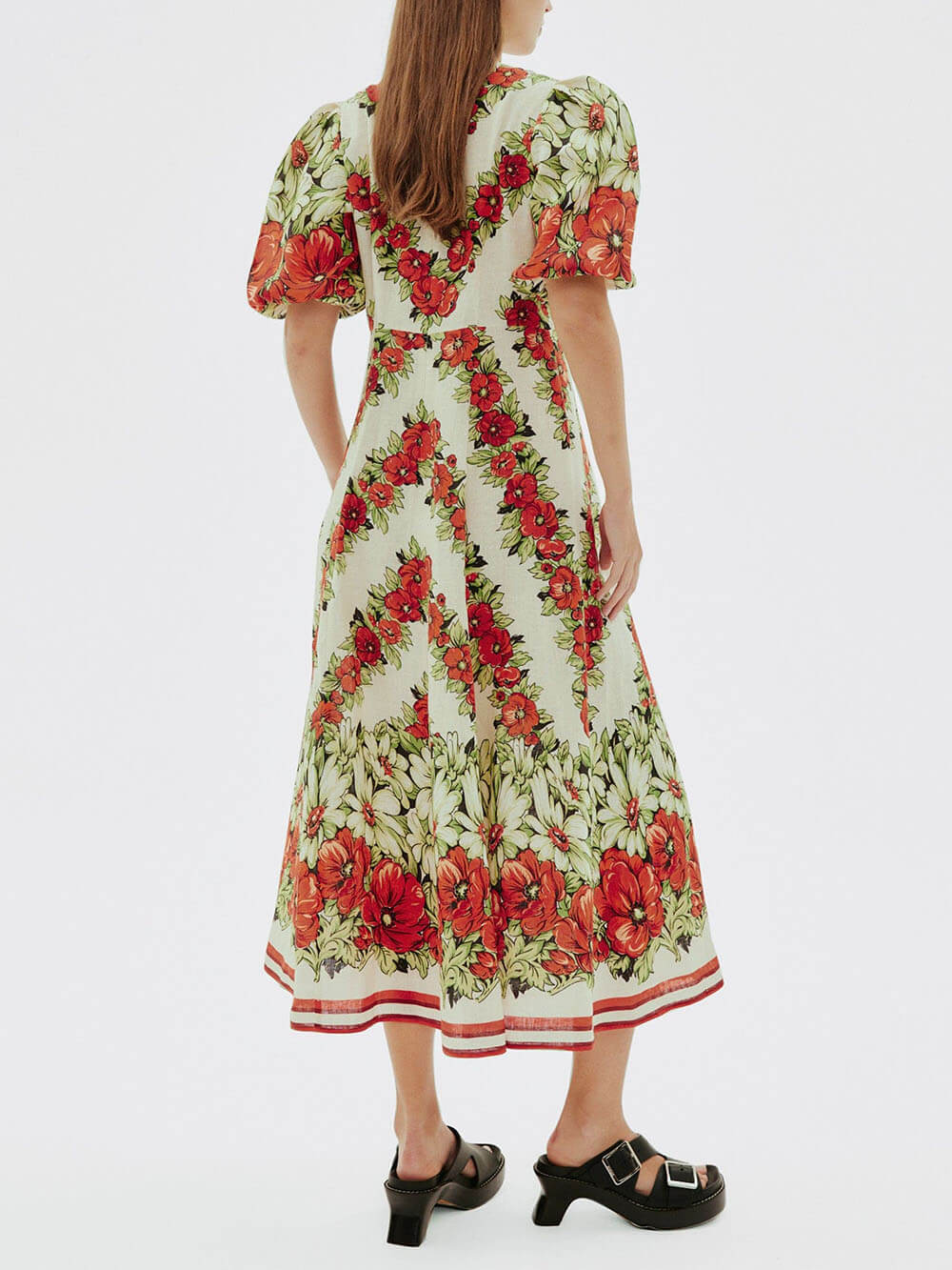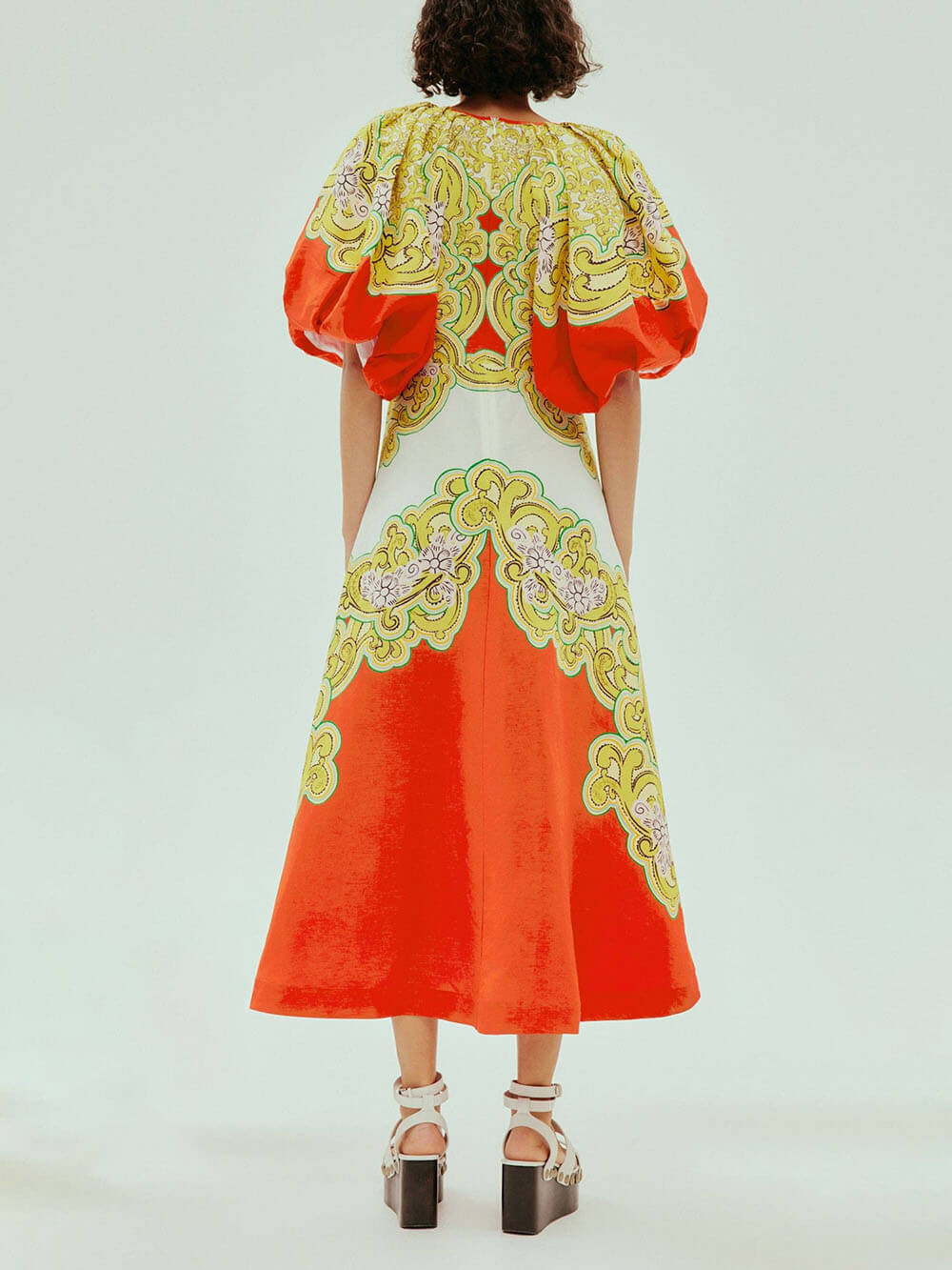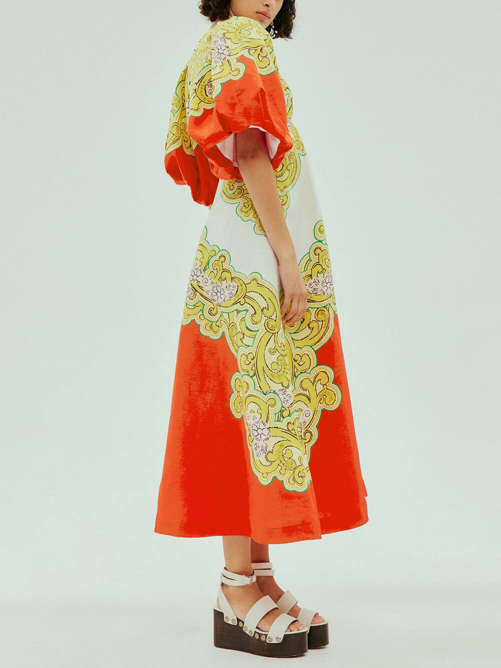Retro Unique Oil Painting Print Ruffled Pleated Slit Midi Dress