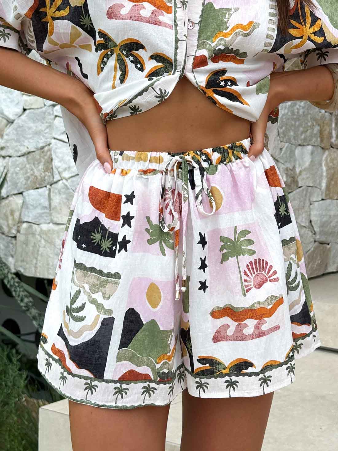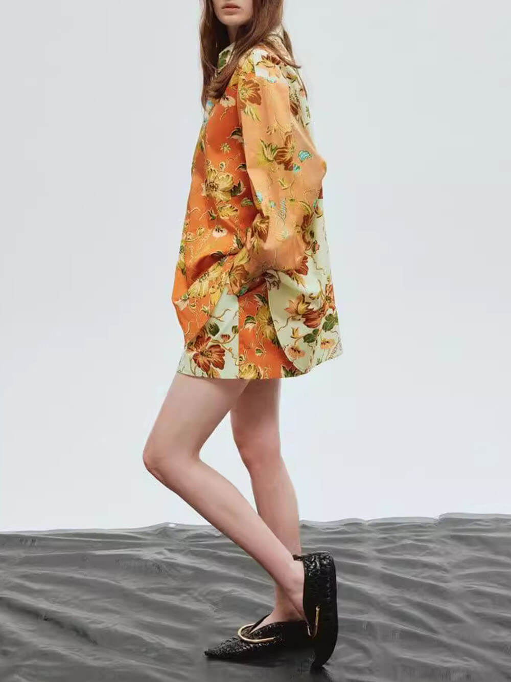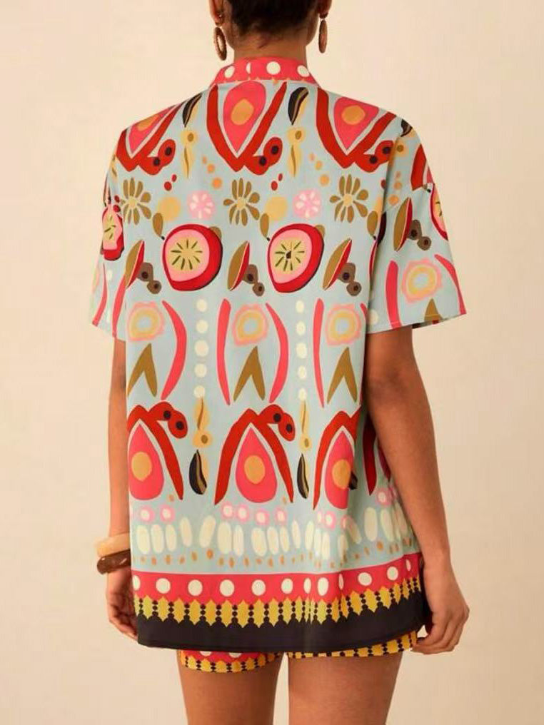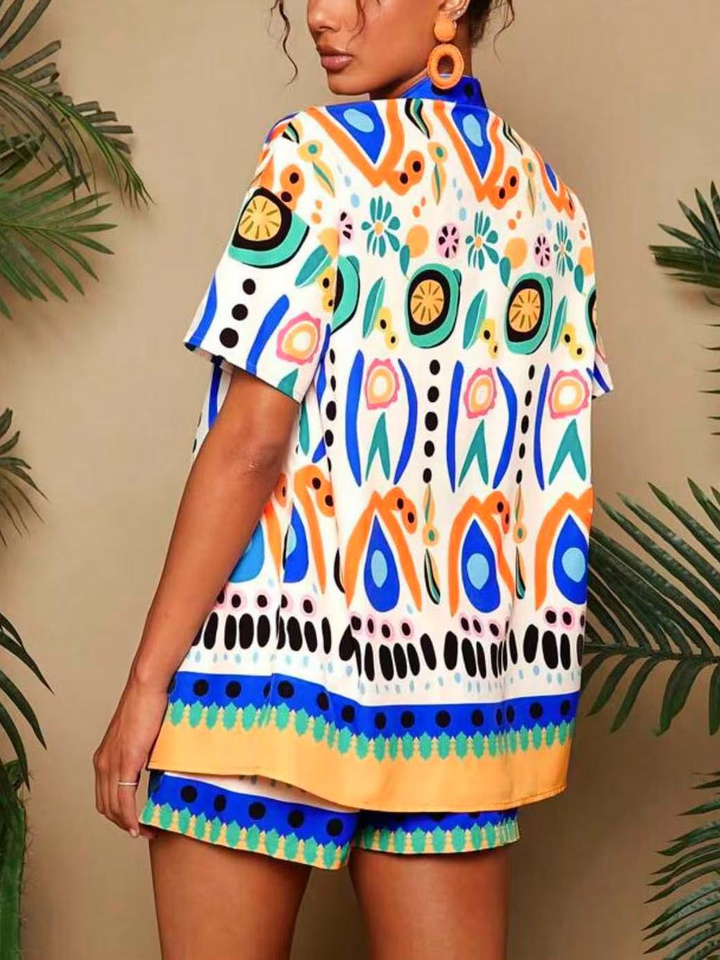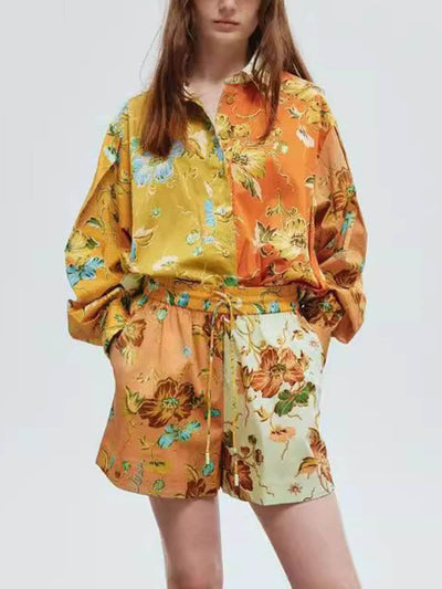 Unique Floral Print Wide Sleeve Shirt and Elastic Waist Pocketed Shorts Set