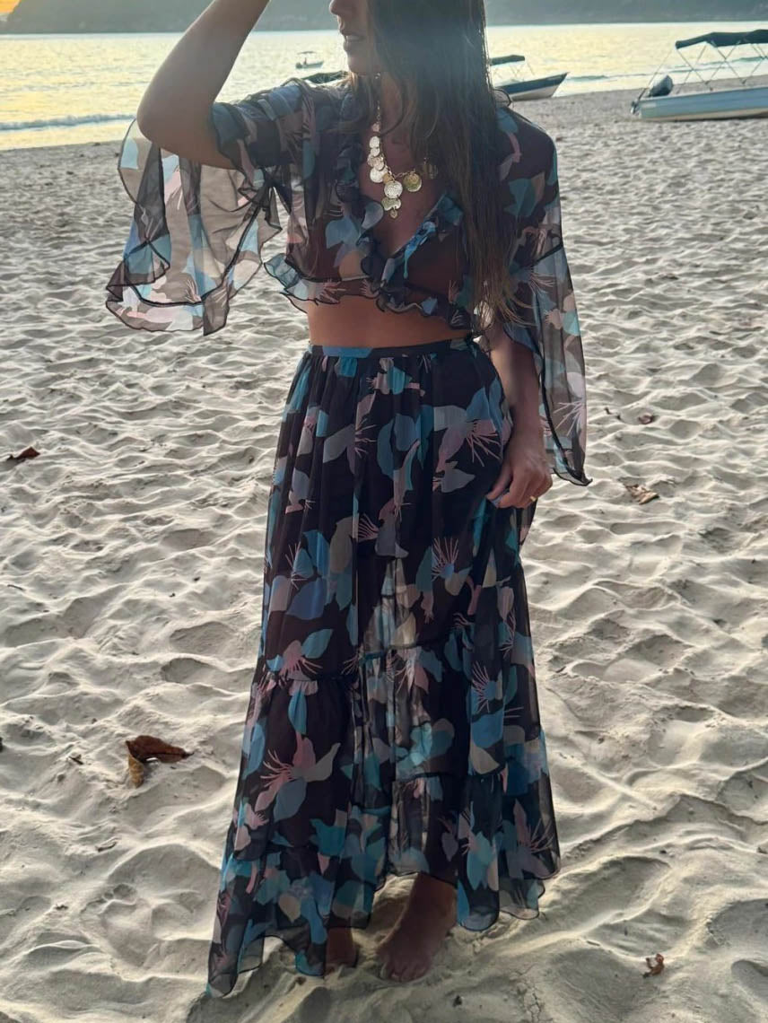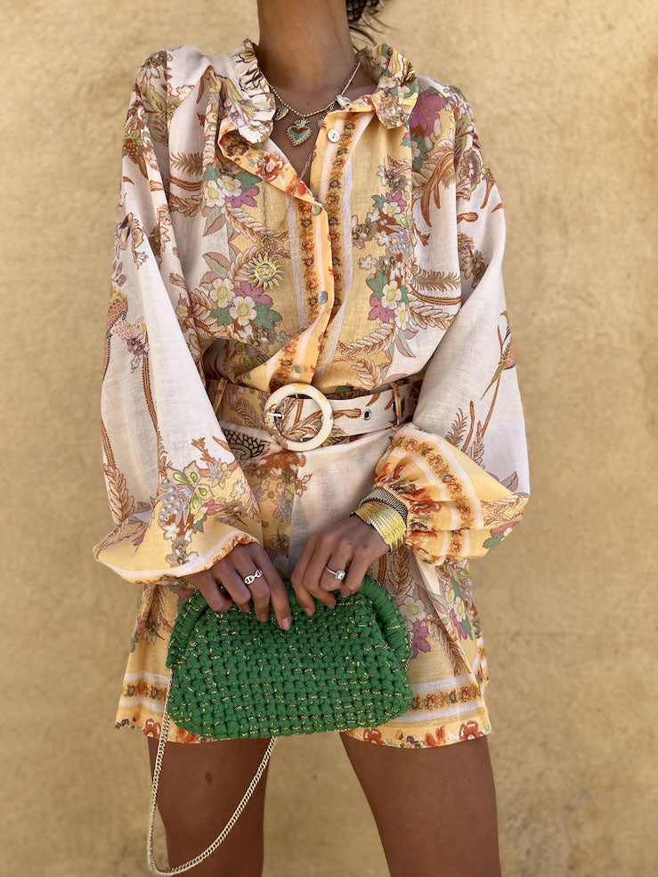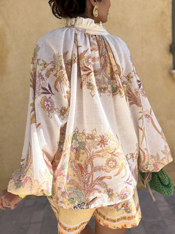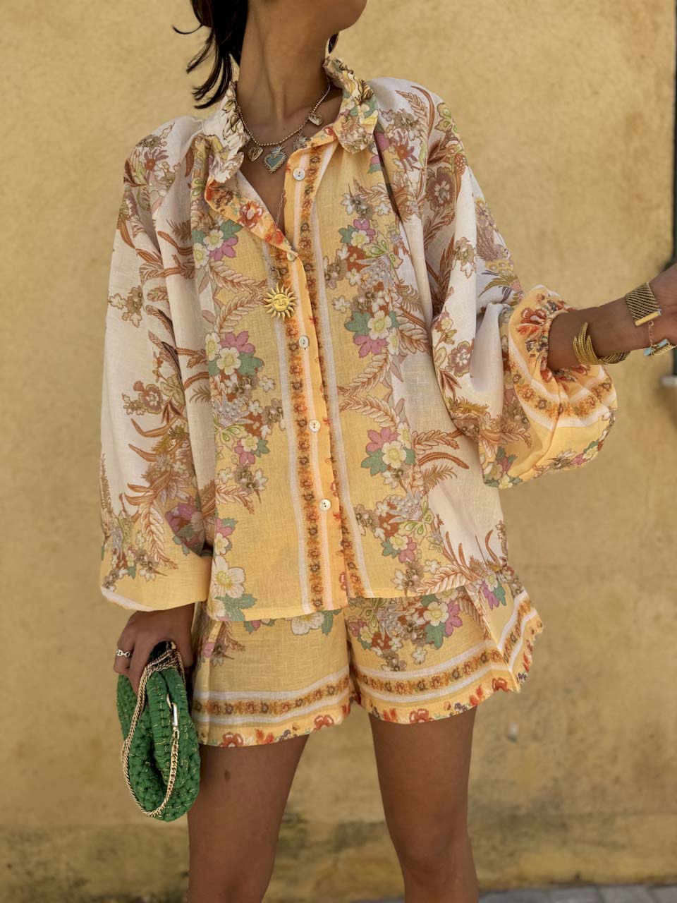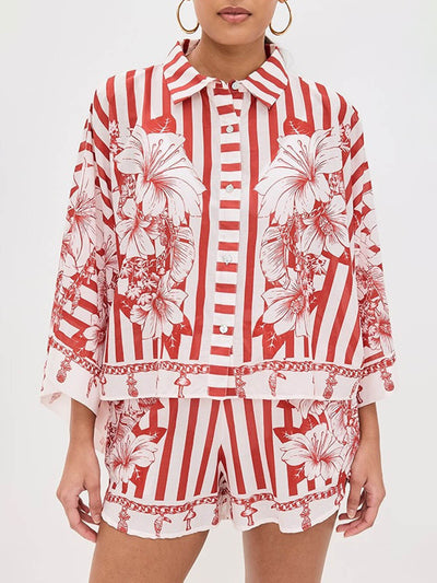Stay stylish and comfortable in our unique floral print wide sleeve shirt and elastic waistband pocket shorts set.